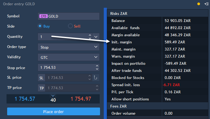 This Initial Margin reflects in the Order Entry window below. (When opening an Order Entry, make sure to click on the light blue line on right-hand border to further open the menu)