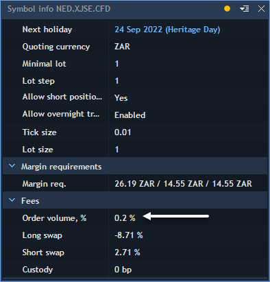 Equity CFDs carry a Broker Fee, of 0.2 % of the Position Exposure, with a minimum of R50 when you enter, and again when you exit the position. (Order Volume – under Fees ZAR in the Order Entry Window above)