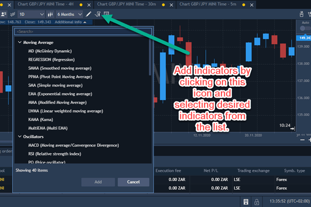 10. Add your desired indicators by clicking on the “Add Indicator” button which is a square root sign over a candlestick. I suggest you add the MACD, Stochastic and 2 EMA’s of values 3 and 15. This will need to be done on each individual chart tab.