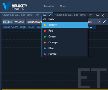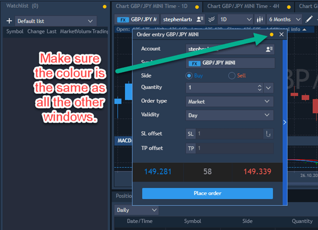 11. On the web based platform, the order entry is a separate floating window that you can access from the Terminal menu. Once opened, be sure to link it to all of the other windows by selecting the relevant colour.
