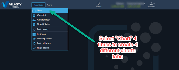 3. Once you have a blank workspace, Click on the “terminal” menu on the top left and select Chart. Do this 4 times to create 4 different chart tabs.