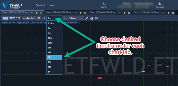 5. Choose the desired timeframe for each chart tab by clicking the dropdown menu where it says 1m by default. I would recommend using the following timeframes for each separate chart: 1D; 4H; 30min; 5min. You can always change these at a later stage if you wish.