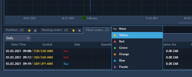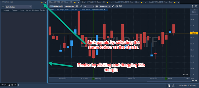 7. Once added, remember to link the panels by selecting the same colour as the chart panels. You can also resize this pane by clicking and dragging in the vertical margin.