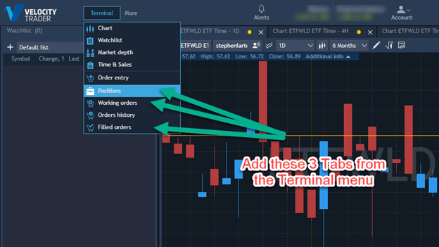 8. Add Positions, Filled Orders and Working Orders tabs by selecting them from the Terminal Menu.