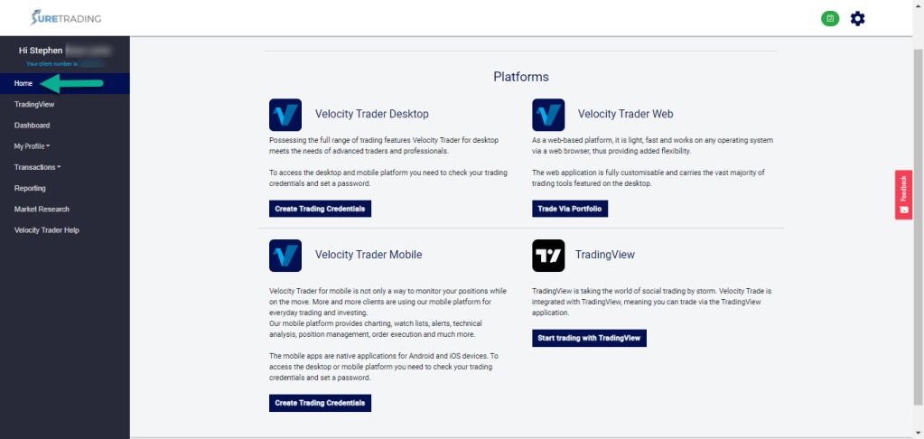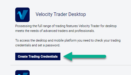 4. My suggestion would be to use the Velocity Trader desktop platform (Windows-based) as it is the version with the most features. So, click on “Create Trading Credentials.