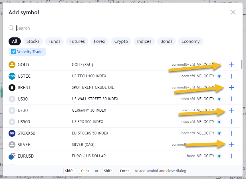 4. The Symbol Search window will now appear showing only the Velocity instruments. You can add the instruments you would like to your list by clicking on the ‘+’ to the right of each item. You can also search for what you are looking for in this window as before.