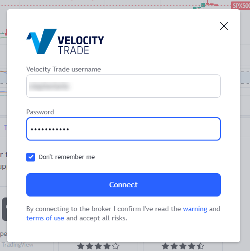 4. Type in the credentials that you would use to login to your normal Velocity Trader desktop platform and then click “Connect”
