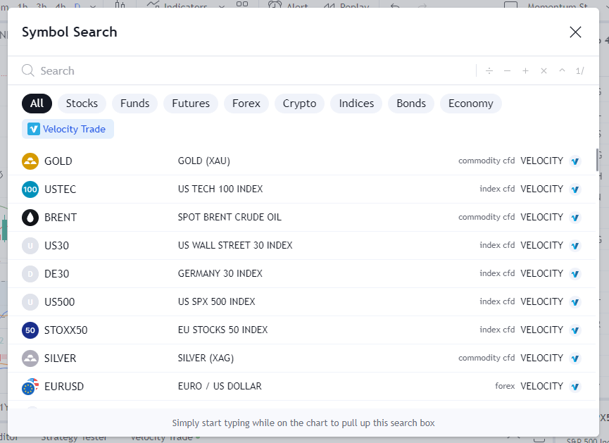 Being the world’s biggest trading community, it can sometimes be hard to find the correct instruments to trade on TradingView. This guide will show you how to find all of the Velocity Trade instruments on the TradingView platform.